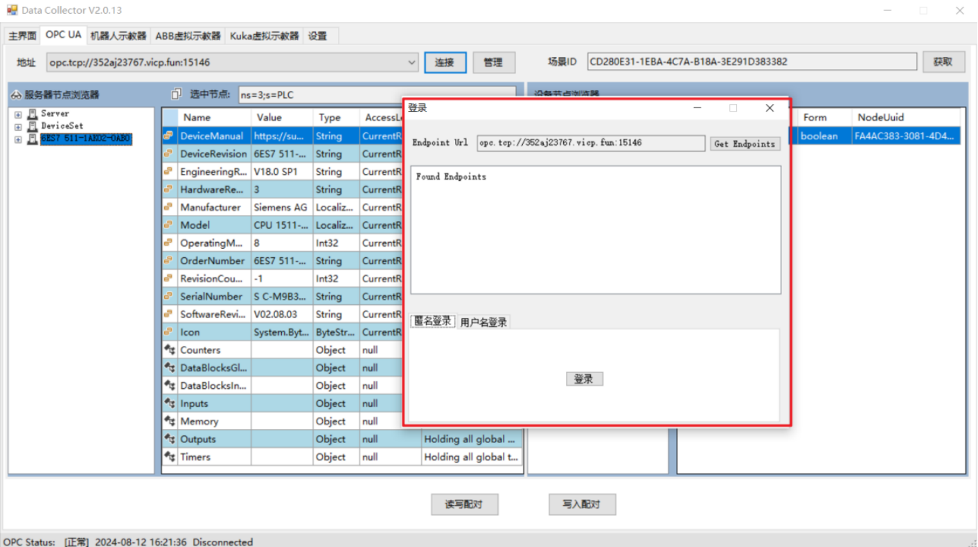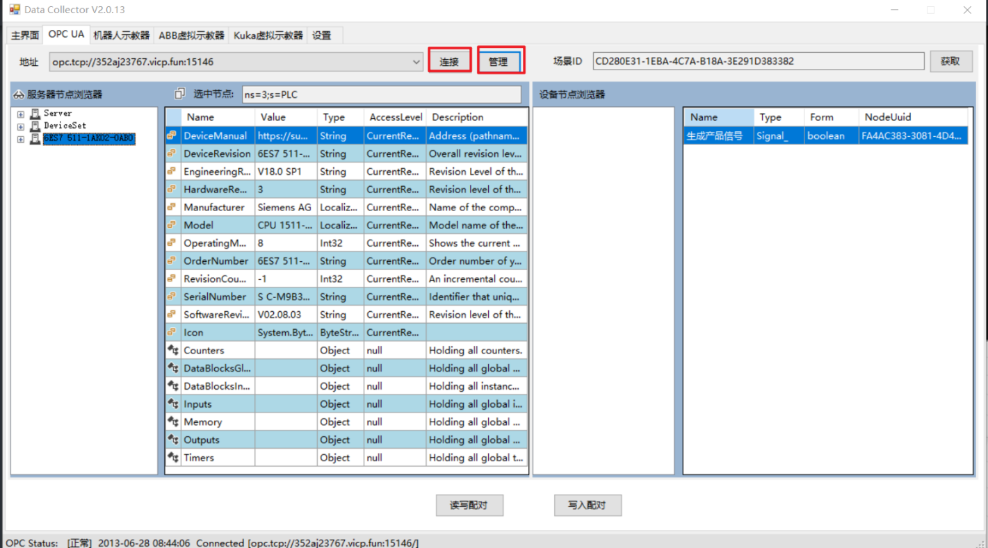 点击连接,可以登录获取plc信号显示在左边