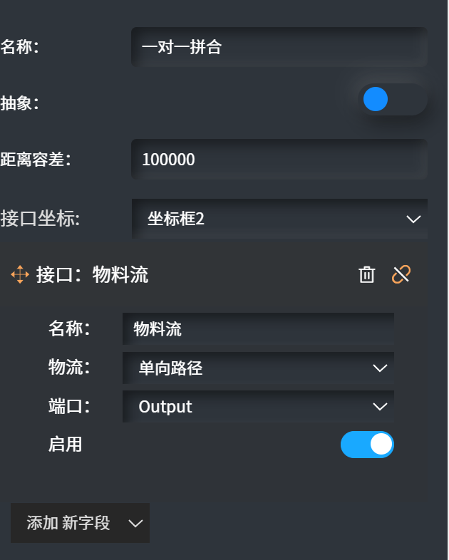 2.设置一对一拼合,在拼合中设置物料流拼合,与物料流关联(此处为单项路径)