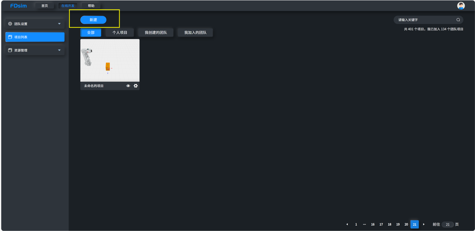 2.在在线开发模式下直接新建项目。