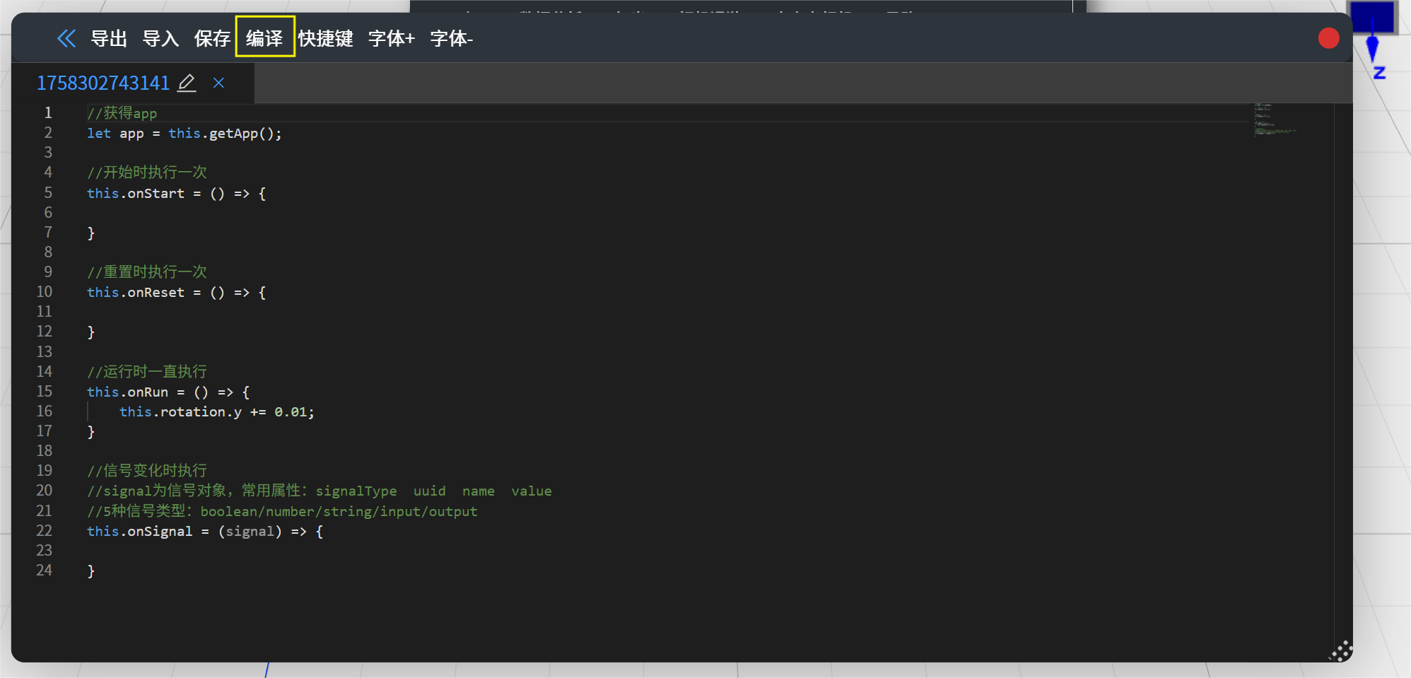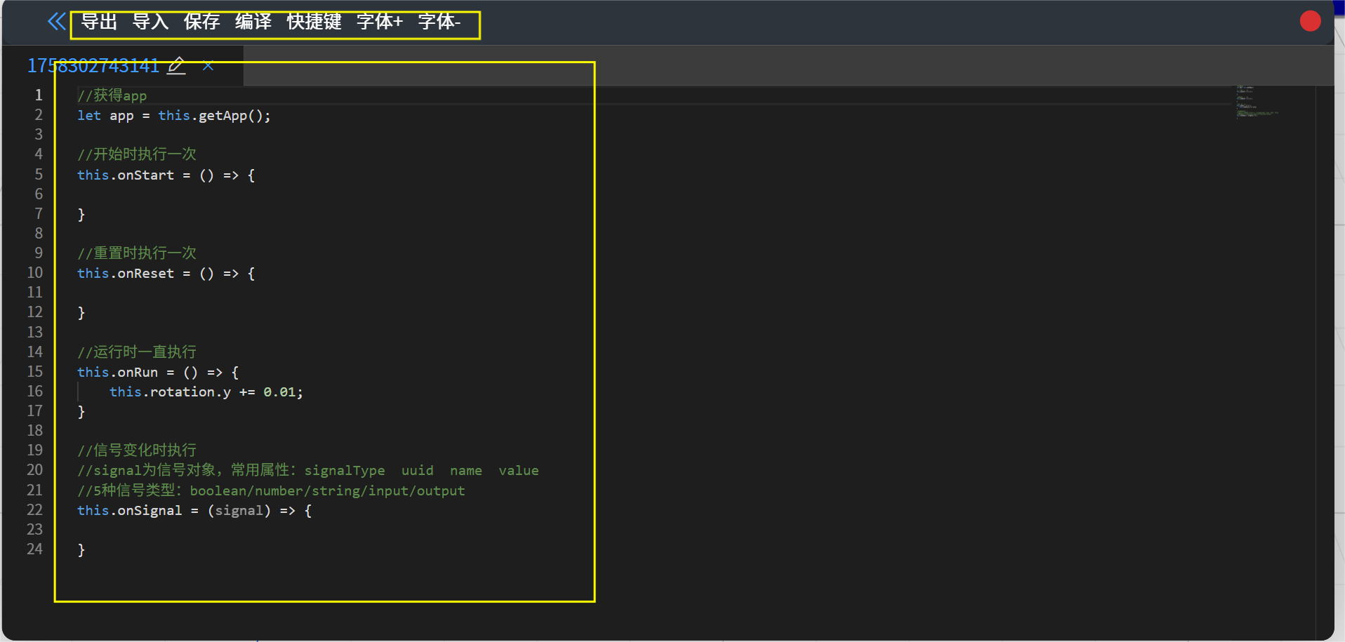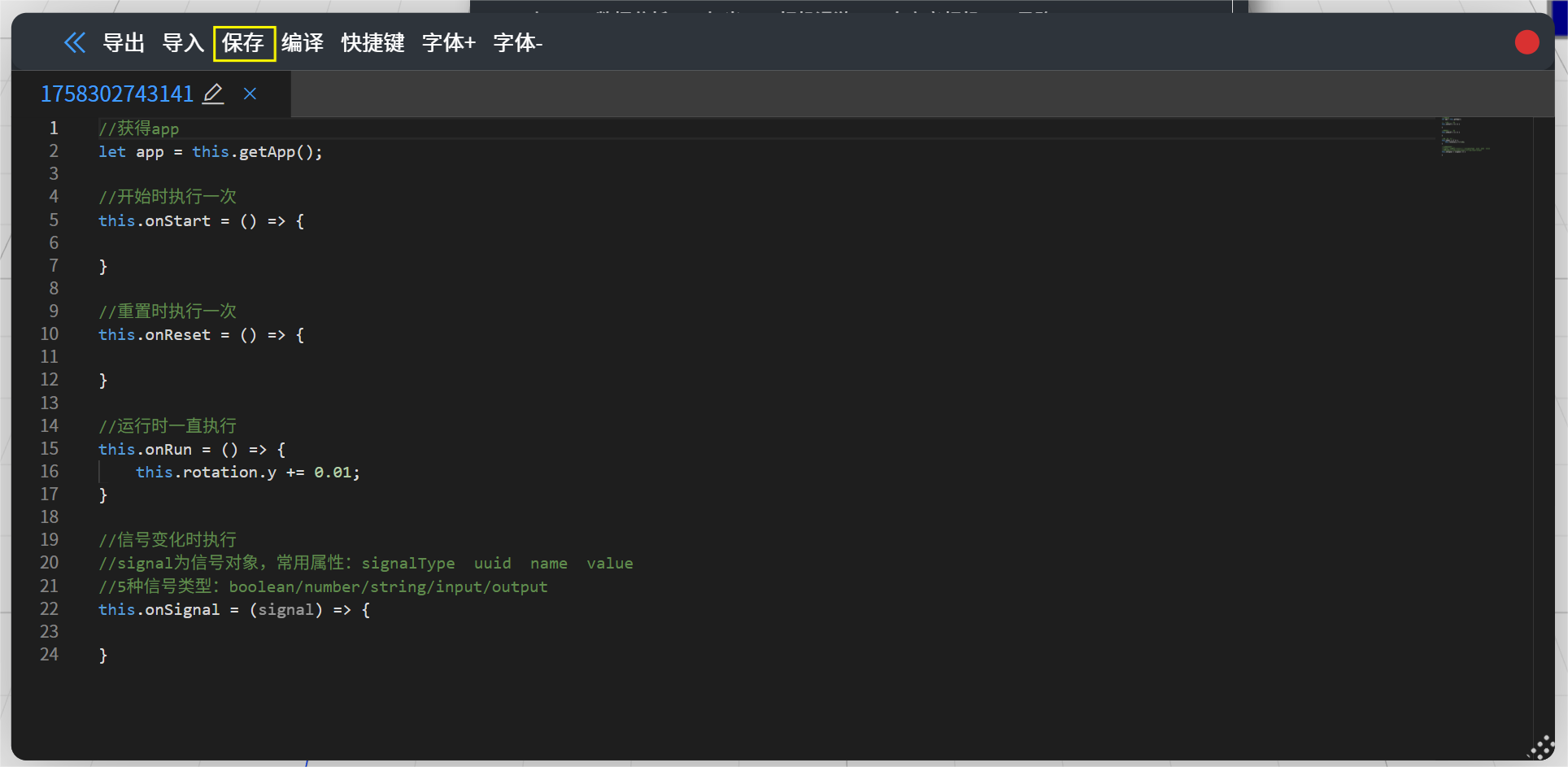 为组件添加脚本,可以实现脚本功能。脚本基于js语言运行。脚本中存在基础设置,可以在用以确定脚本运行的时间。