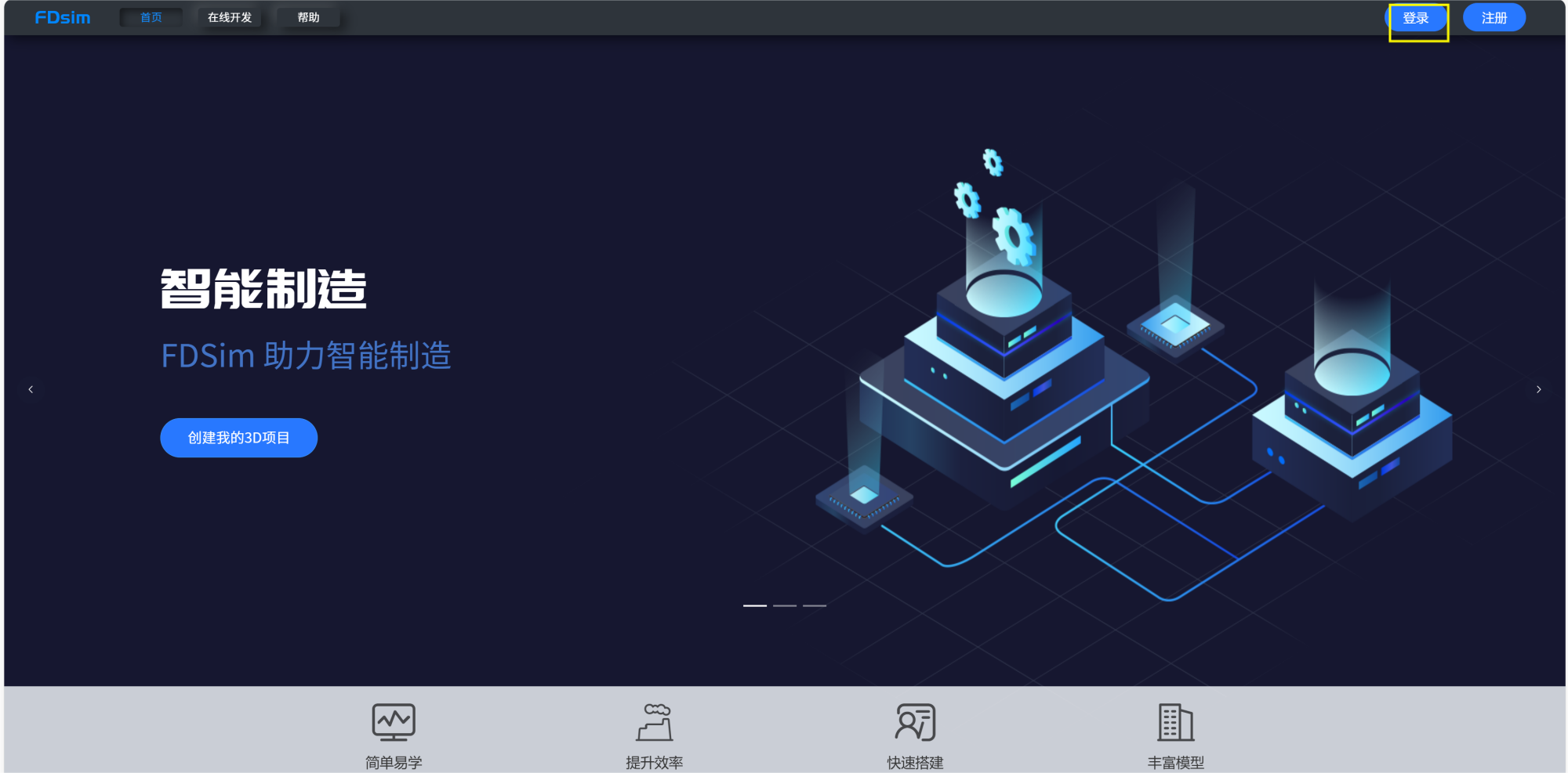 在浏览器地址栏中,输入FDSim网址(http://fdsim.com),出现主界面,如果已经有账号,可点击“登录”进入登陆界面进行登陆。